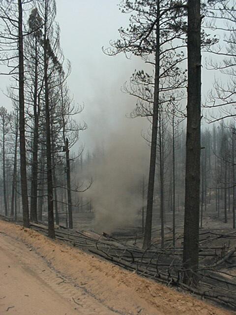showed flames in the burned out remnants of stumps and trees. Dust devils